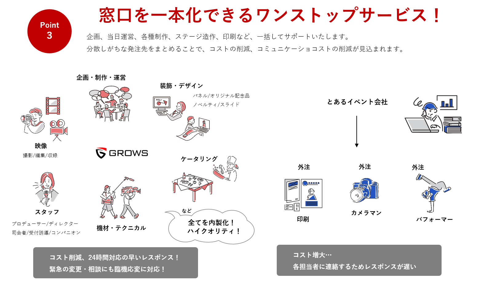 GROWSは、単なる演出アイデアの提供だけでなく、企画から当日の運営まで一貫してサポートできます。初めて表彰式を担当する方も安心して任せられる体制を整えています。