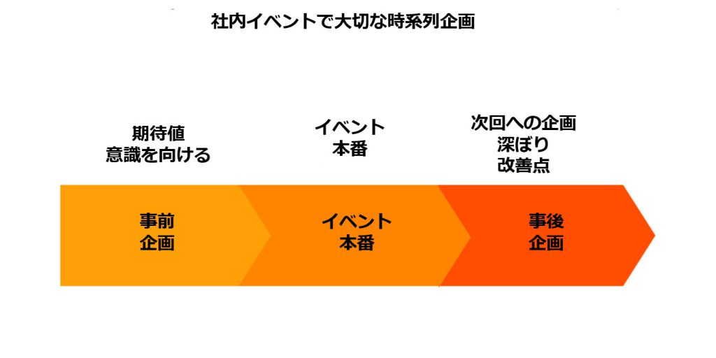 前述させていただいた内容と重複する部分ではありますが、社内イベントにおいて大切なことは時系列を意識した企画設計です。イベント本番を中心とした前後でどのような企画が立案できるのかを考えることでイベントが立体的になりより参加者のマインドに企画を届けることができます。