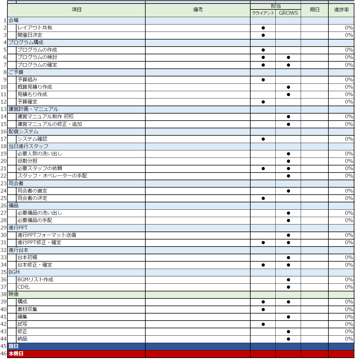 発生する可能性のある業務を一覧化させ、タスク化させておくことで抜け漏れなく本番を迎えることができます。