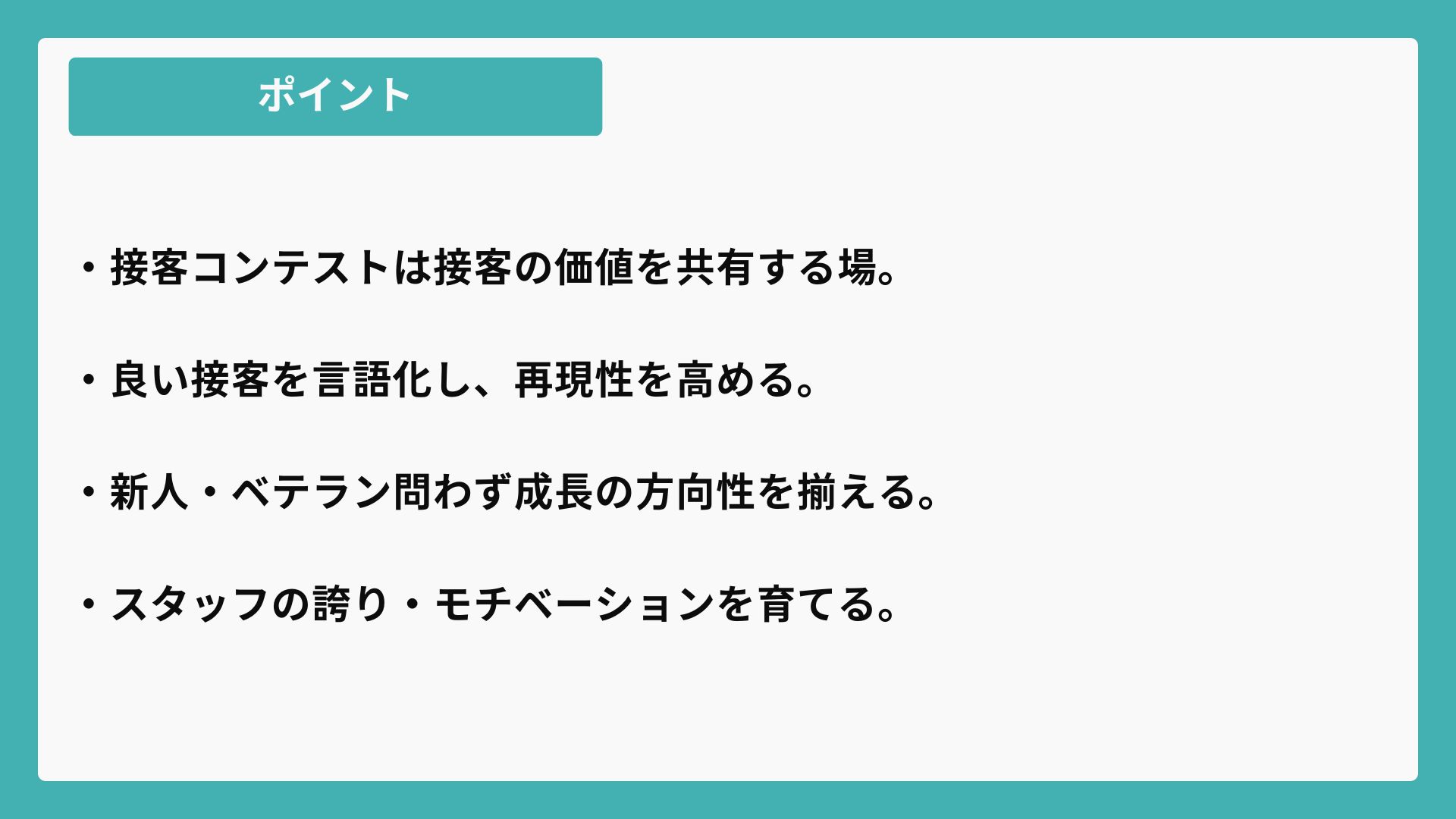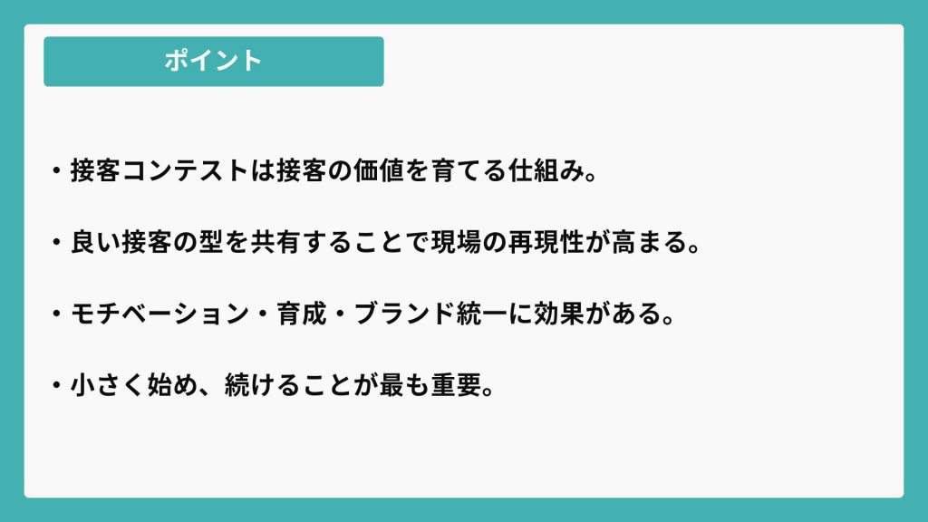 社内接客コンテストは、単なる技術競いでも、イベント的な盛り上げ施策でもありません。
