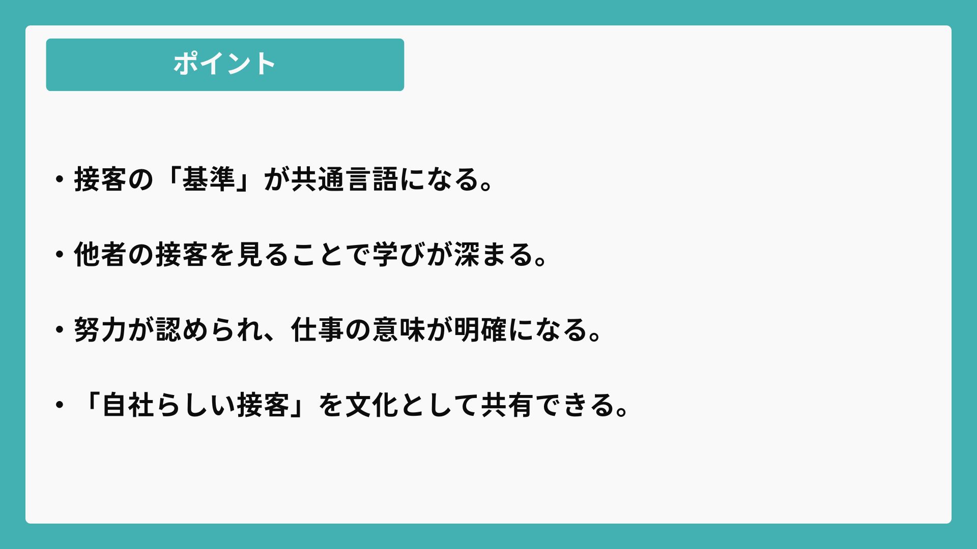 「うちの会社は接客を大切にしている」というメッセージにもなり、ブランド文化の土台にもつながります。