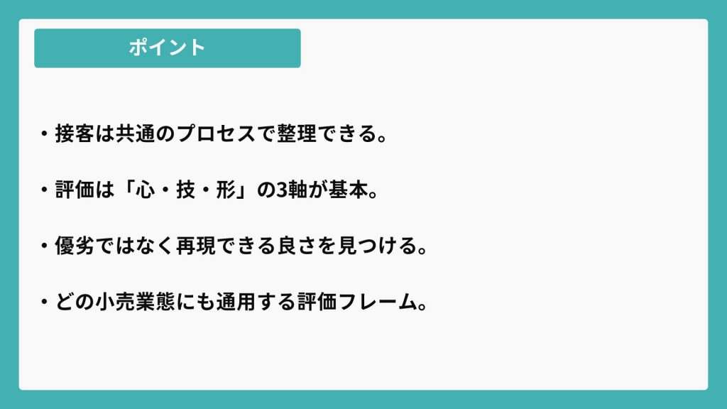 接客コンテストの評価は、業態や商品が違っていても共通の視点で整理することができます。
