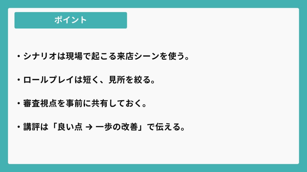 まず前提として、ロールプレイは「日常の接客がそのまま舞台にのったもの」であるべきです。一度きりの特別な演技ではなく、明日からまたできる行動であること。そのために、シナリオはできるだけシンプルで再現性のあるものにします。