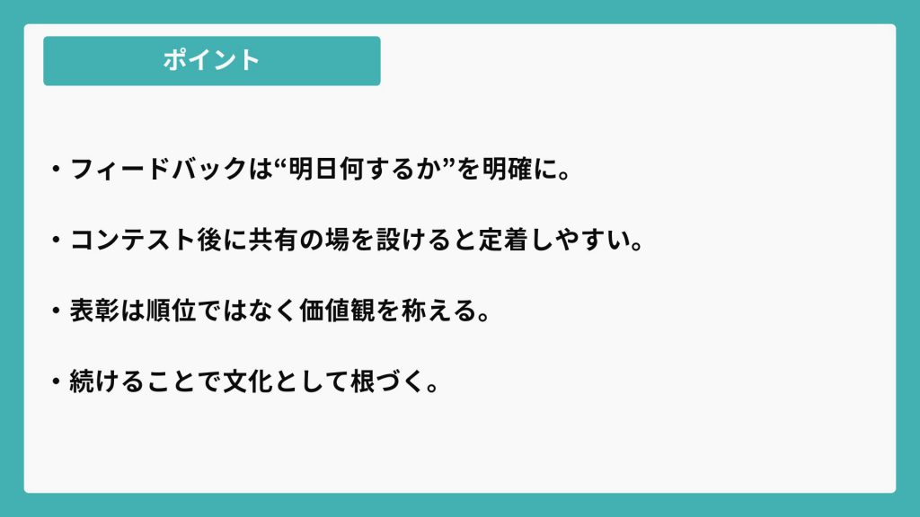 そのために、コンテスト後のフィードバックと表彰の設計は、準備段階から丁寧に考えておく必要があります。