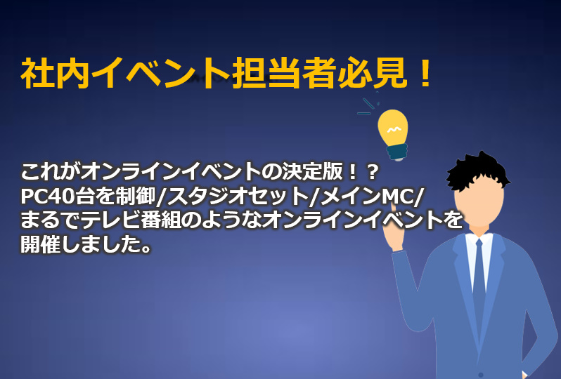 今回は、パソコン40台・スタジオセット造作・メインMCはあの有名アナウンサーという、これぞ本気のオンラインイベントということで企画を致しました。