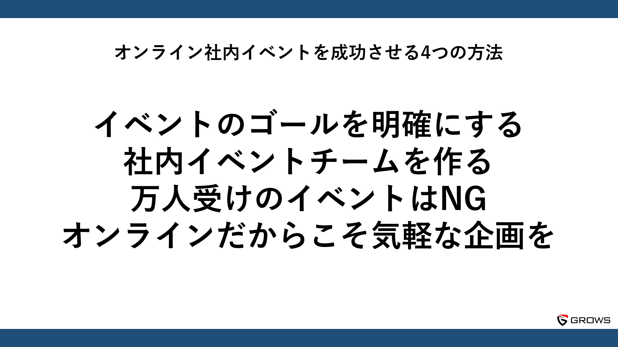 まずは、なにが達成できたら成功とするのかを決定し、そのゴールへ向けて企画を組み立てていくと、質の高いオンラインイベントになります。