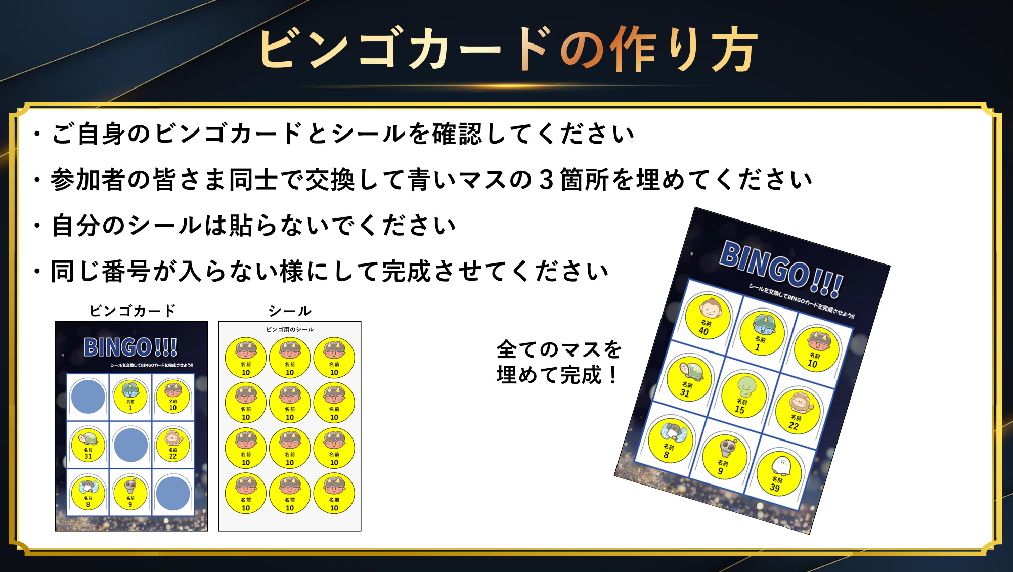 そのシールを参加者同士で交換し合っていただきビンゴカードを埋めていっていただきます。