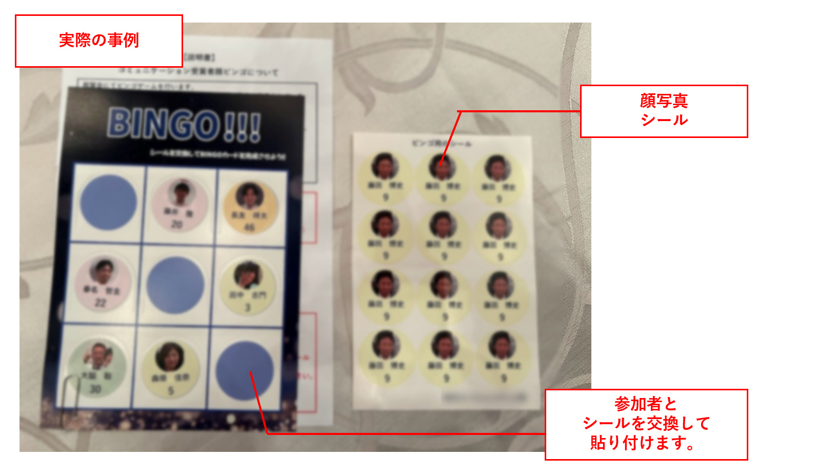 参加者の皆さんには、空のビンゴカードとご自身の顔写真入りのシールを配布いたします。