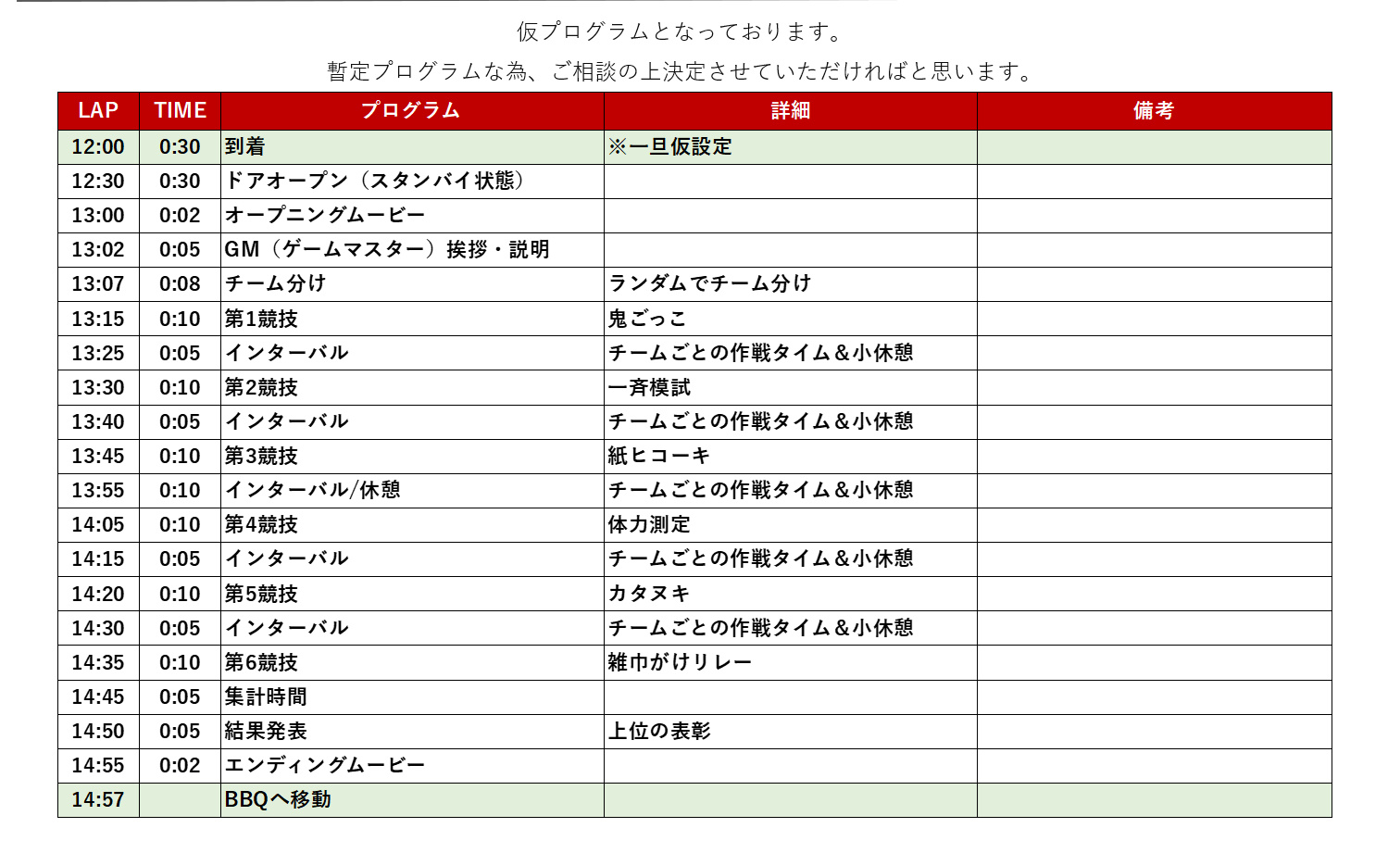 いかがでしたでしょうか?今回はあの番組をイメージした制作をご紹介させていただいております。このようなテーマ性のあるものからオリンピックやワールドカップなどをイメージした企画もご提案褪せていただいております。非日常ではいつもと違ったコミュニケーションが生まれます。組織における上限関係だけでなく斜めの距離感の関係構築にもチームビルディングのアクティビティは有効です。是非ご相談いただければと思います。