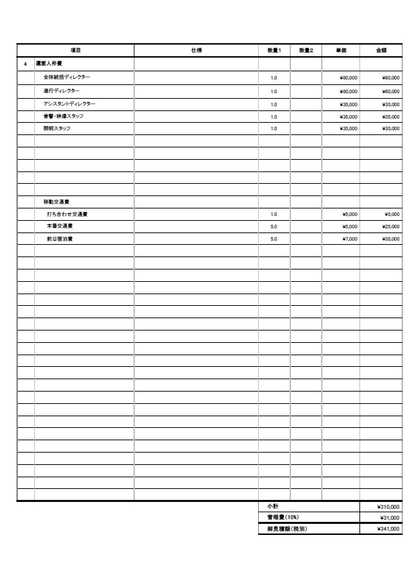 こちらはイベントに使う機材関係の費用です。この項目は何を使うかで大きく金額が変わってきます。また時期によって機材の稼働が高い時期は金額も上がったりと時価のような時もあります。例えばプロジェクターは会場に常設物を使うのか、少し良いものを持ち込むのか。社長のプレゼンの時に返しのモニターは設置するのか?など細かい設計を行っていくと必要な機材が洗い出されていくという形です。もちろん会場に機材が充実している場合には会場の設備ででも大丈夫な場合もたくさんあります。ここはプロに任せ、出てきた見積もりに関してしっかりヒアリングしていくことをお勧めいたします。