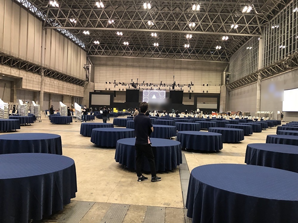 椅子やテーブルの搬入も始まりました。会場らしくなってきましたね。