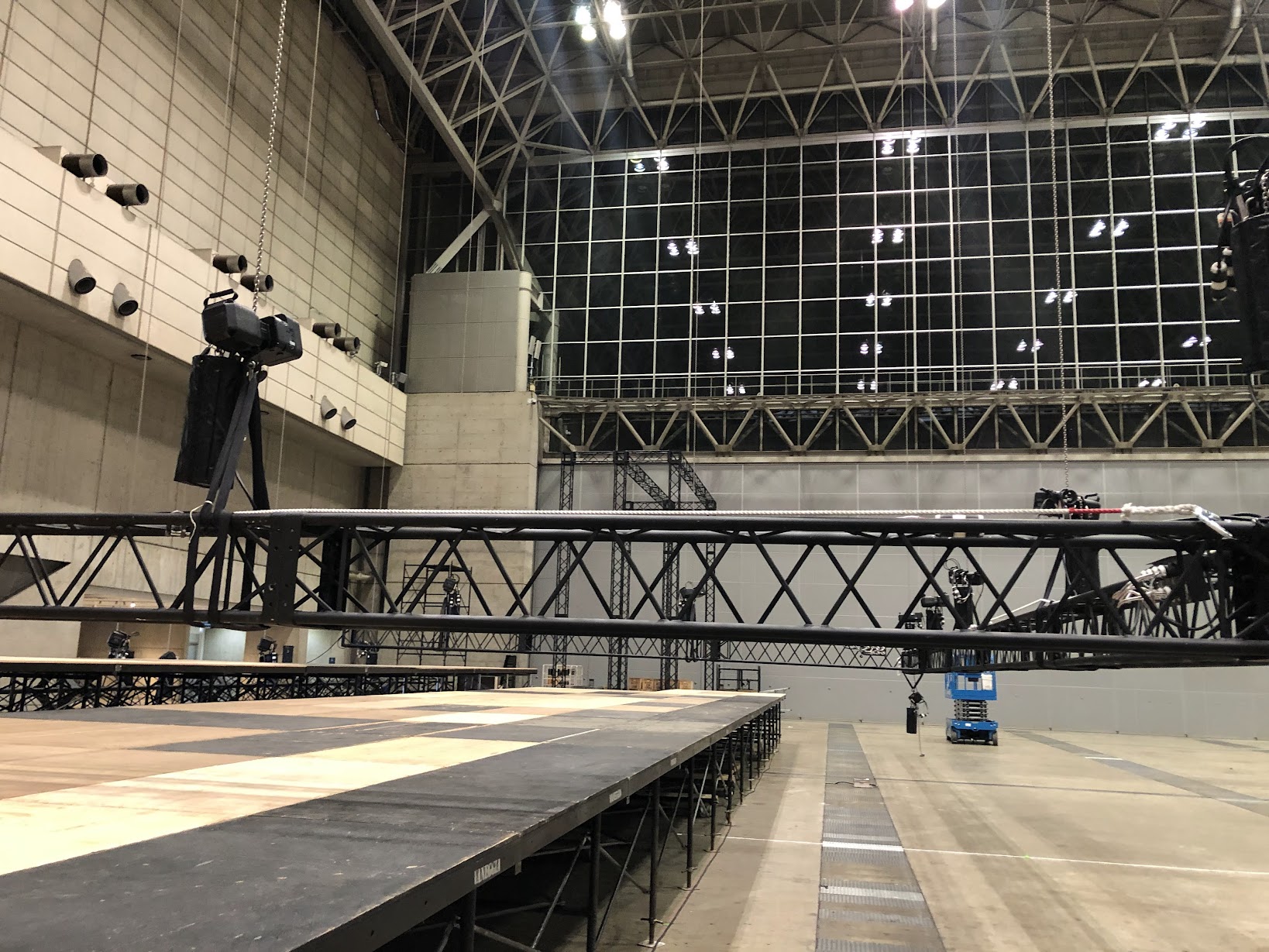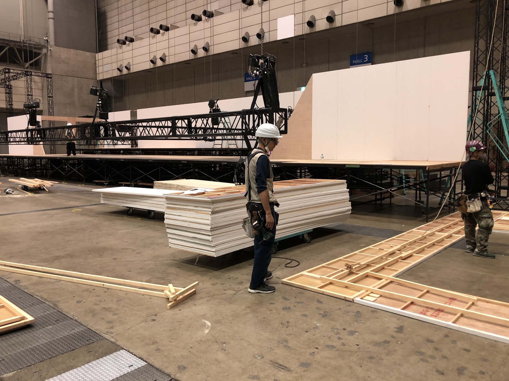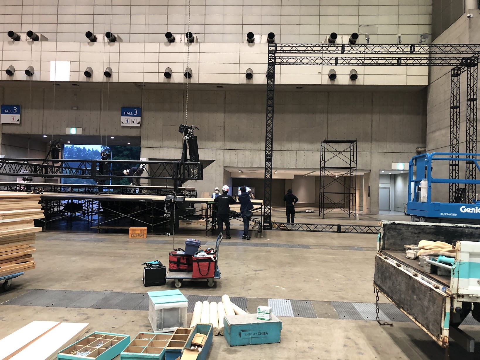 ステージの施工と映像チームが作り上げています。いよいよステージ感ができてきました。