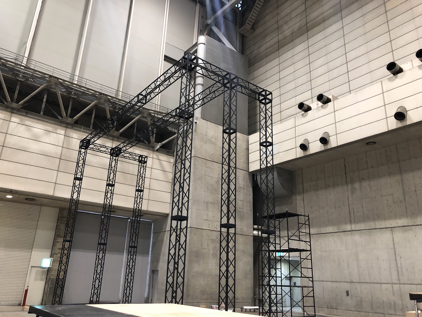 こちらは、トラスと呼ばれるステージなどの骨組みです。これに照明機材や映像機材を設置していきます。がっちりしてますね。