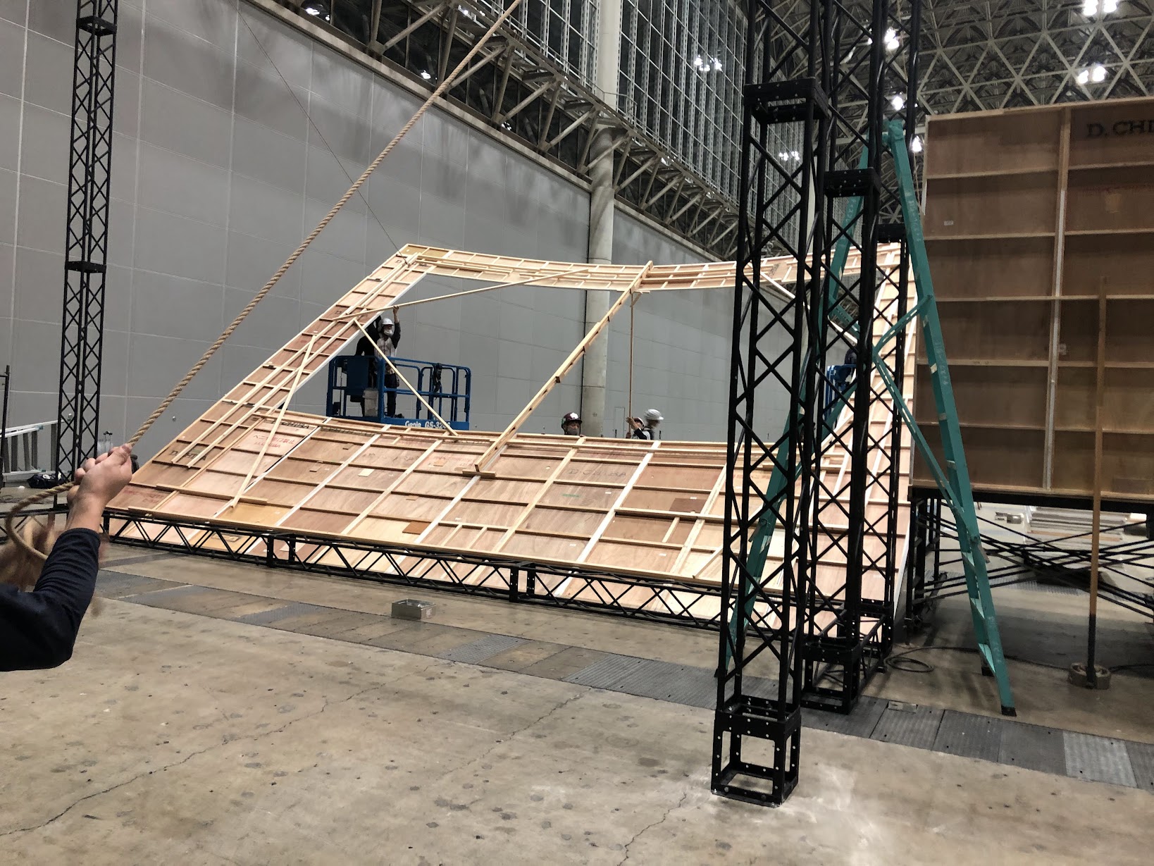 何となくステージの原型ができてきました。このような感じで施工チームが一生懸命くみ上げていきます。