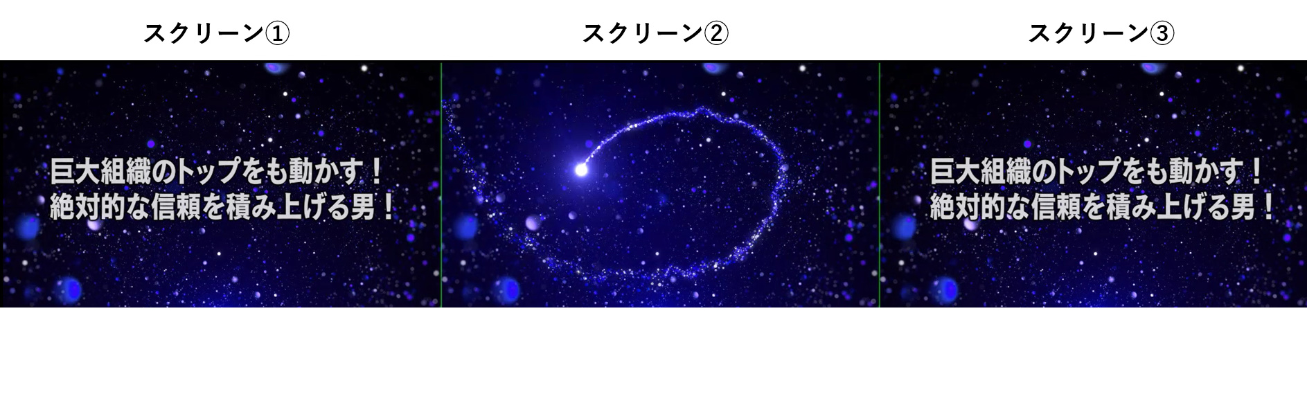 当日のスクリーンが2面・3面とある場合にはそれぞれのスクリーンを連動し形での映像演出も可能です。サンプルは以下となります。3つのスクリーンに違う映像を投影することで演出の幅を広げることが可能です。以下の事例ですと①と③のスクリーンには同じテキストを表示しております。